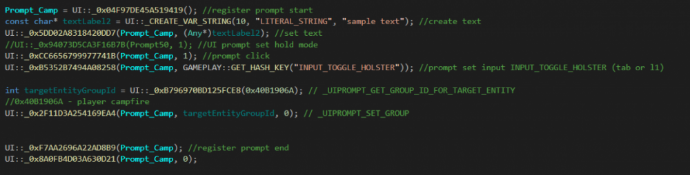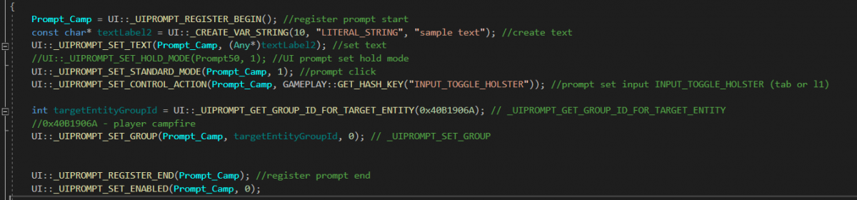 I tried many things but I can't make it work. I attached the code that I have written below. The prompt doesn't show up, I used the UIPROMPT_SET_ENABLE and SET_VISIBLE but still nothing. The hash I placed there was the player campfire according to the object scanner in the rampage trainer. What am I doing wrong?